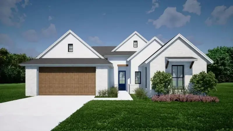 The Trinity is a captivating 3,549 sq. ft. single-story home with a modern farmhouse aesthetic, offering 5 bedrooms, 4 full baths, and a 3-car garage. The heart of this home is an expansive, light-filled open-concept space where the kitchen, dining area, and family room flow together seamlessly, opening to a covered patio for outdoor living. The private master suite is a peaceful retreat located at the rear of the home, featuring a luxurious bathroom, a sizable walk-in closet, and an adjacent utility room for ultimate convenience. This thoughtful layout also includes two bedrooms sharing a Jack & Jill bath, masterfully combining sophisticated design with the ease of single-story living.